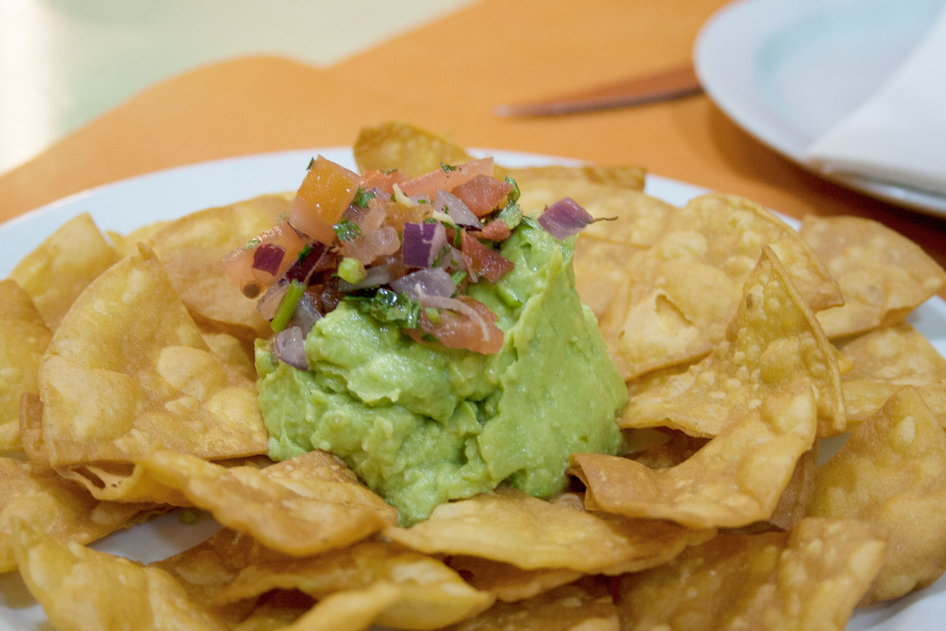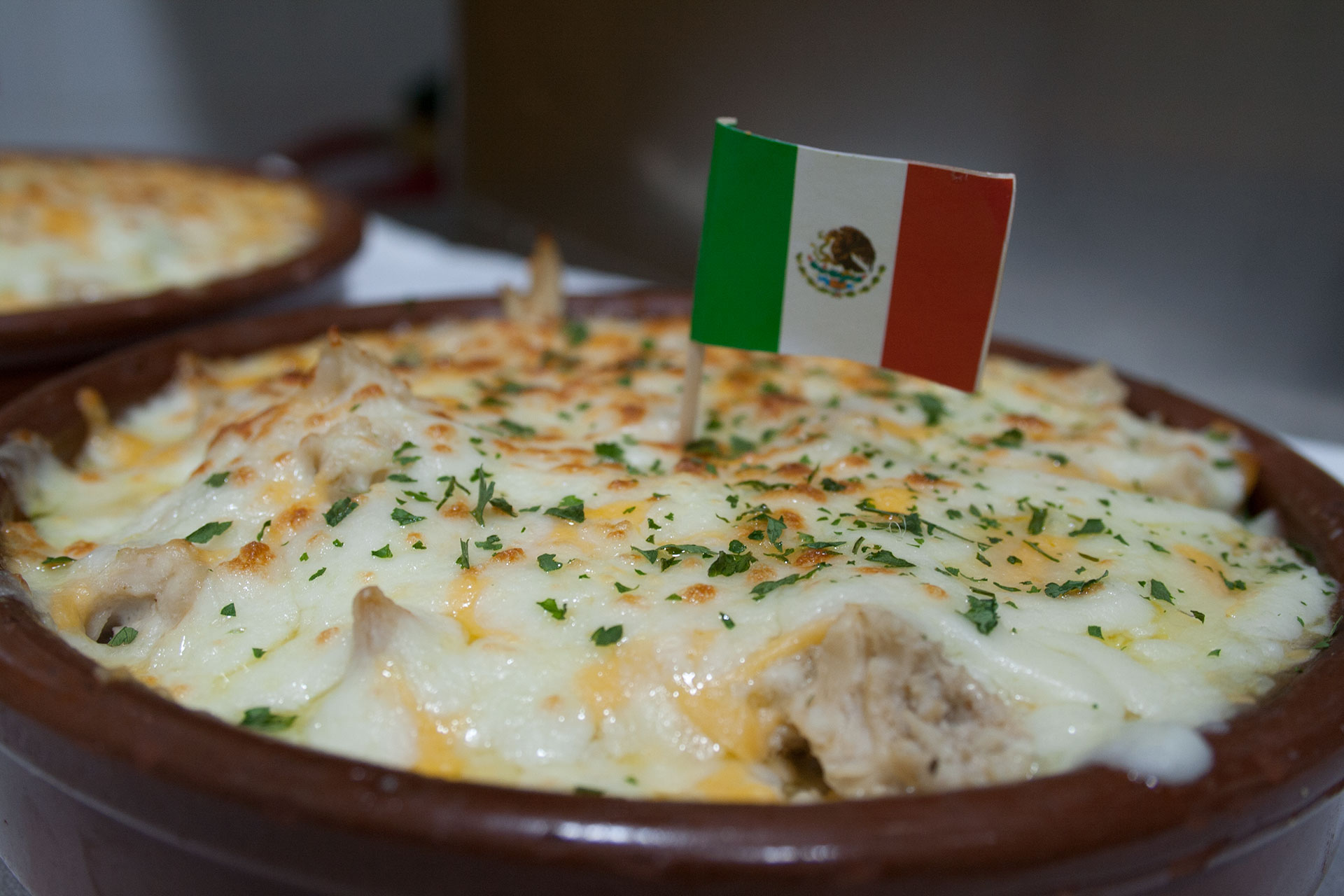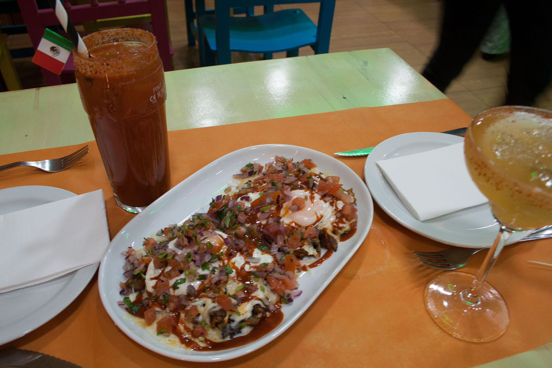 Nachos con salsas y guacamole, fajitas, burritos y cócteles en un restaurante animado y vistoso.